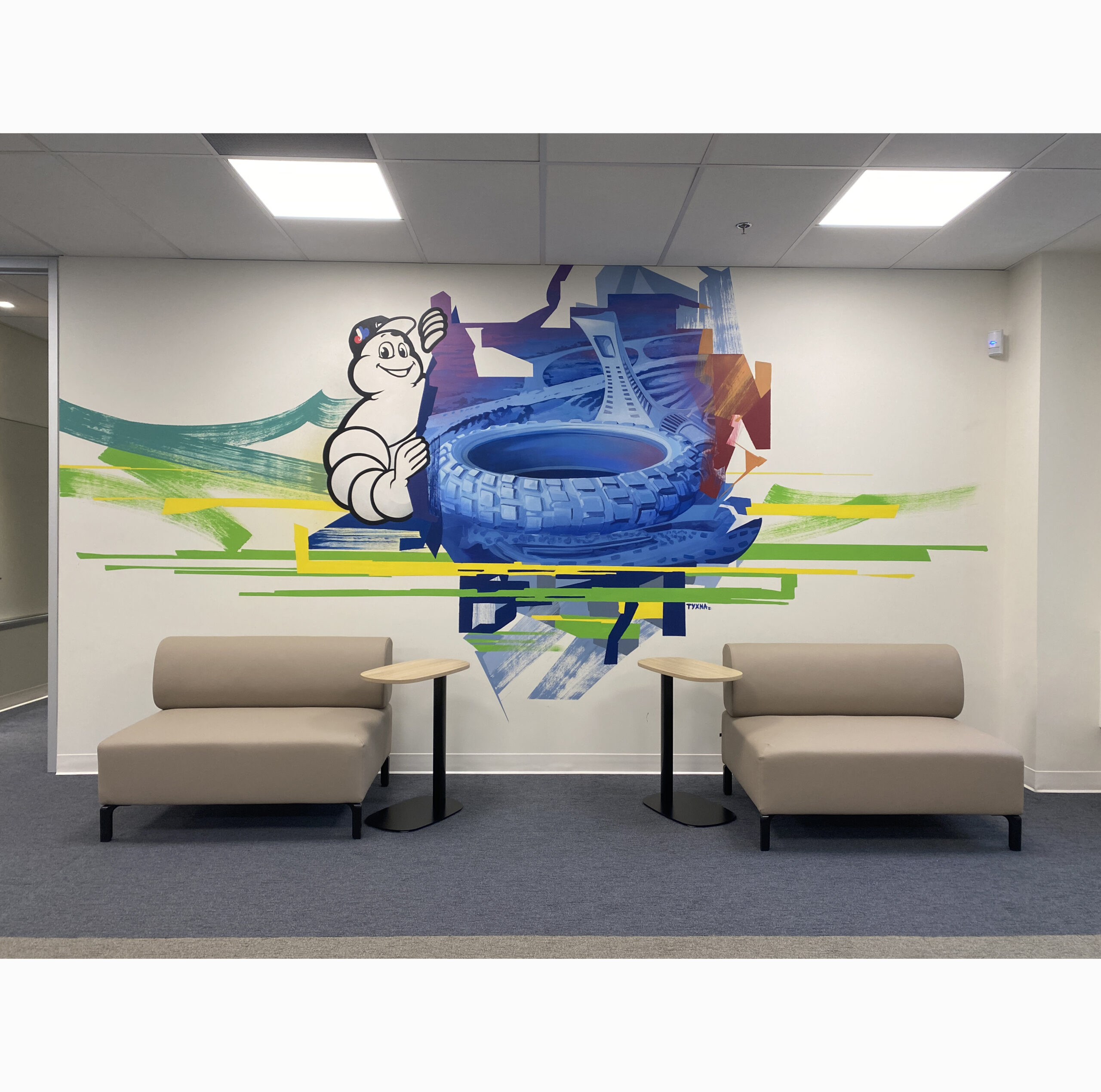 Sa composition repose sur des axes inclinés, des lignes franches et des motifs géométriques qui créent une impression de mouvement continu, soutenue par une palette dominée par le bleu et le vert, rehaussée d’accents contrastés. Cette approche visuelle confère rythme, profondeur et dynamisme à l’espace.