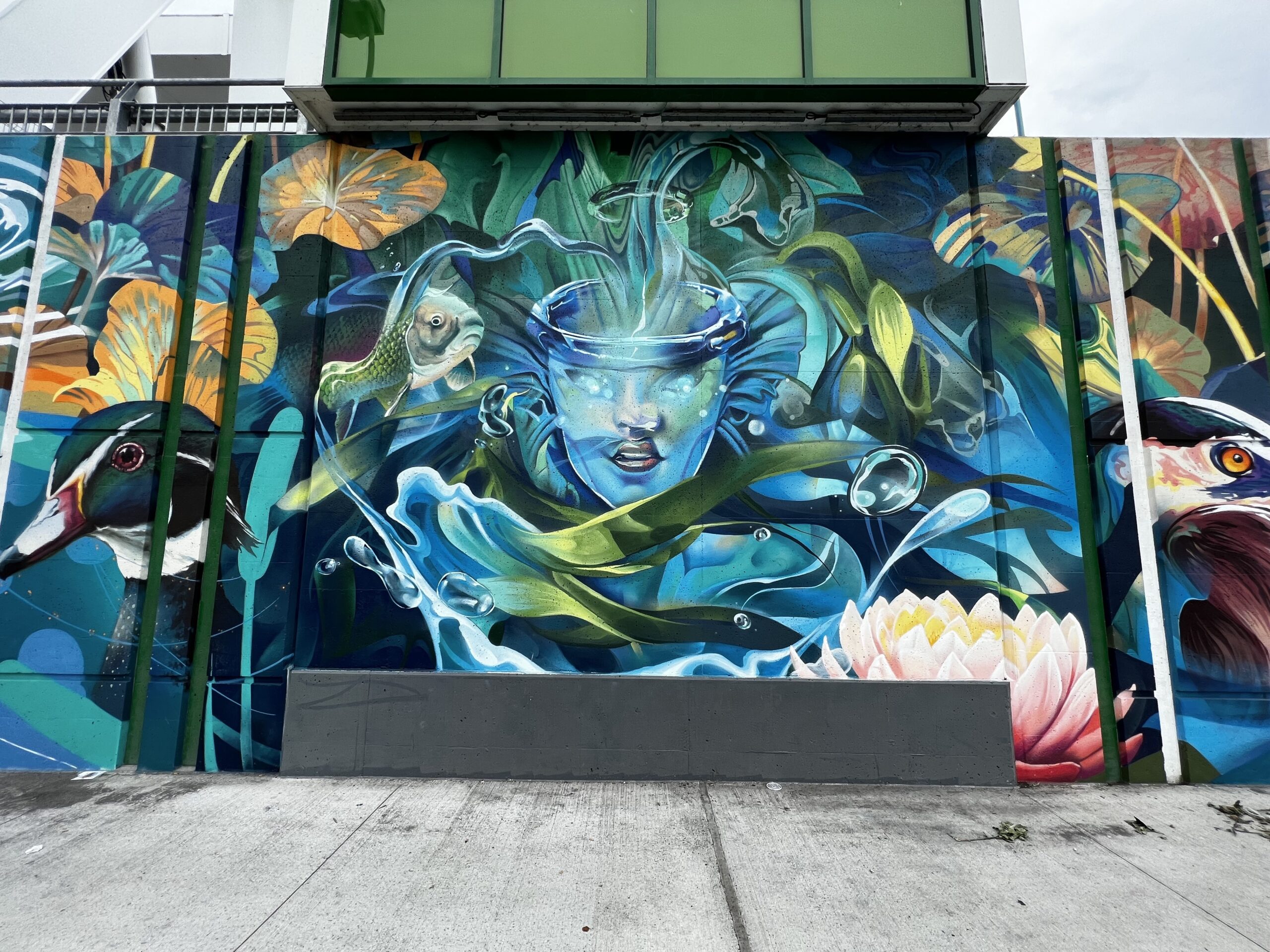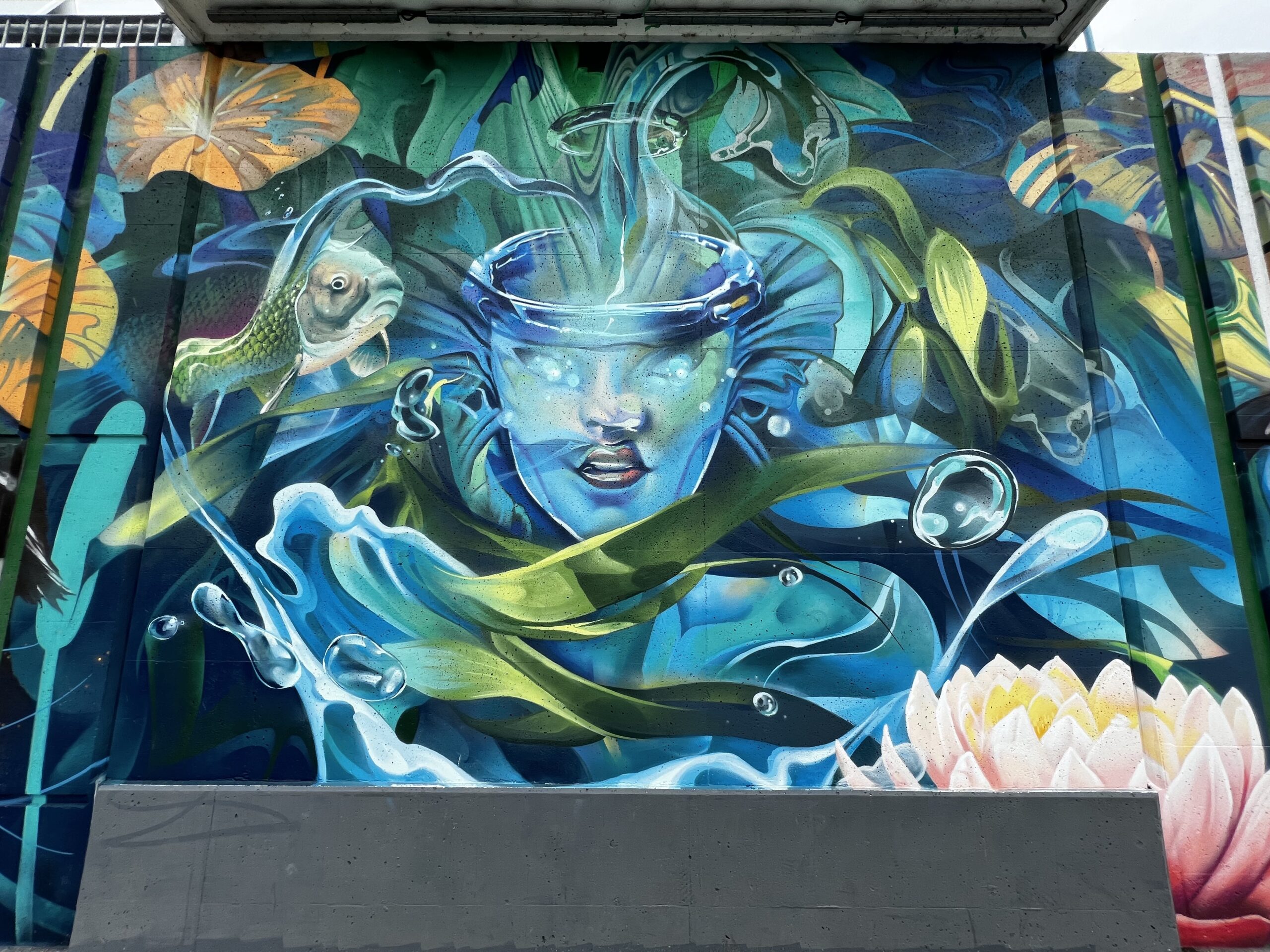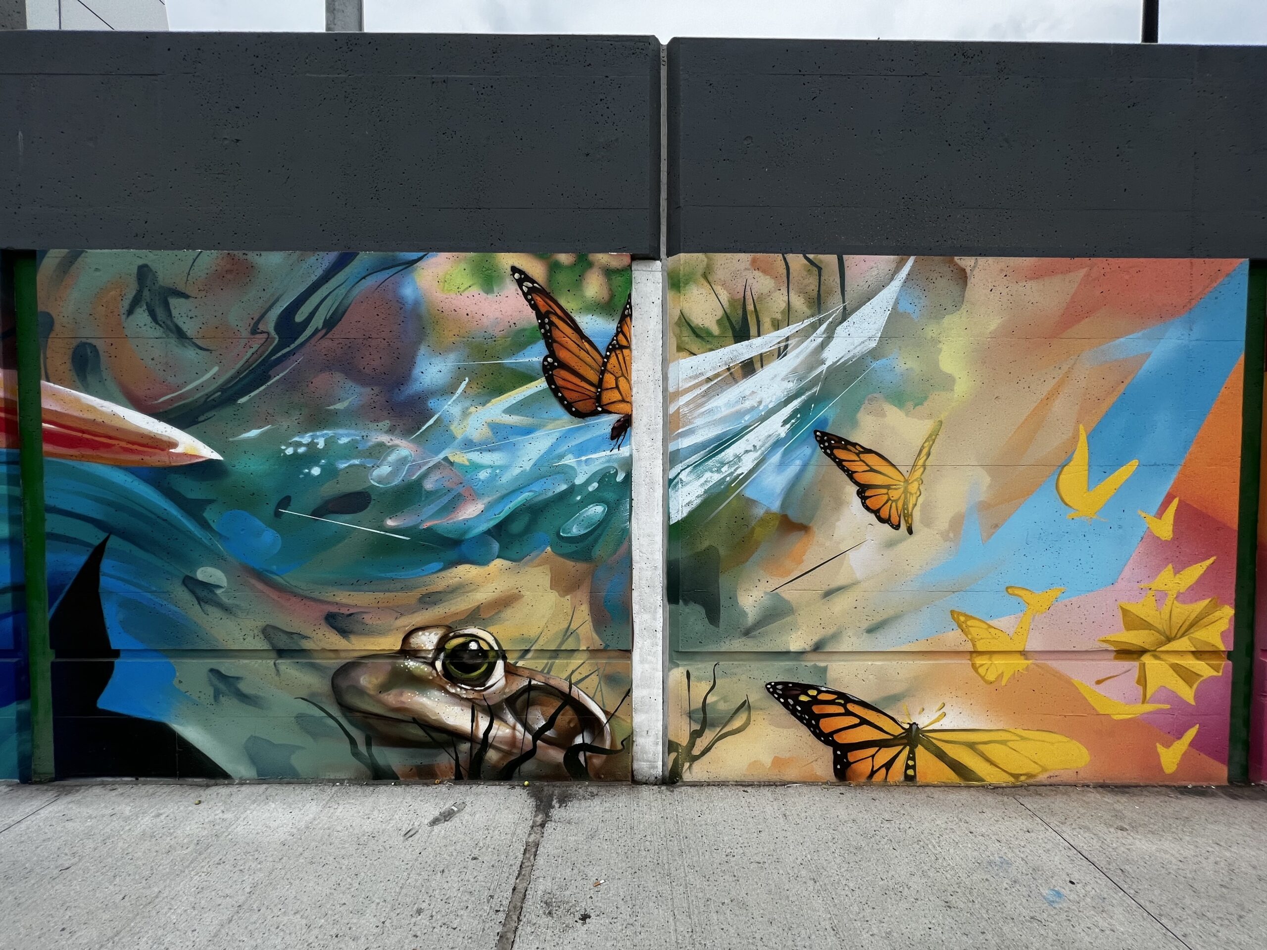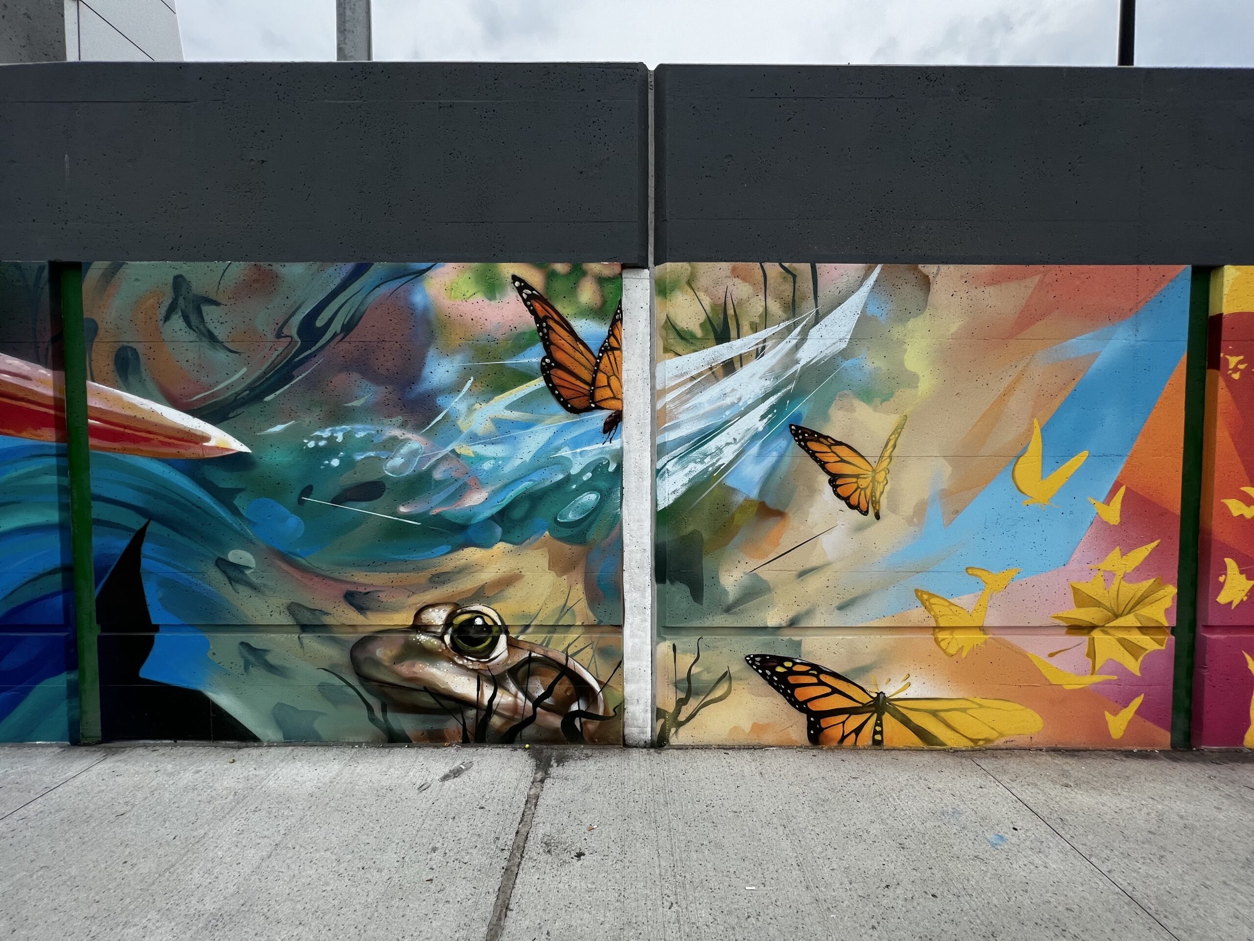 Située au pied du pont Gouin et de sa structure moderne, la murale L’Onde puise son inspiration dans l’univers du conte et dans le lien vital qui unit les riverains à la rivière Richelieu. L’histoire qu’elle raconte s’ancre dans un environnement onirique où la métaphore occupe une place centrale. Cette narration symbolique offre une double lecture qui résonne dans l’inconscient collectif en mobilisant des valeurs universelles.