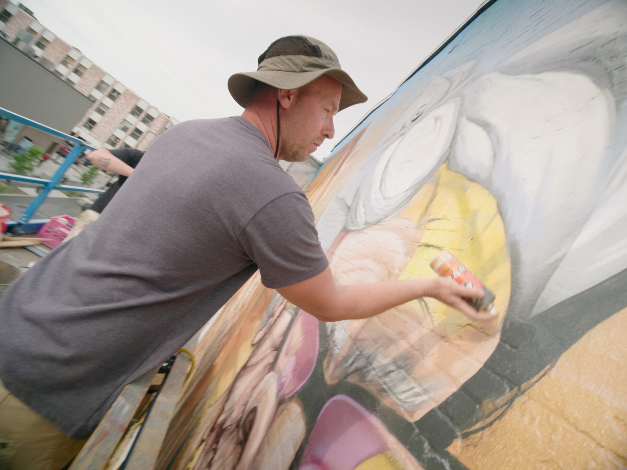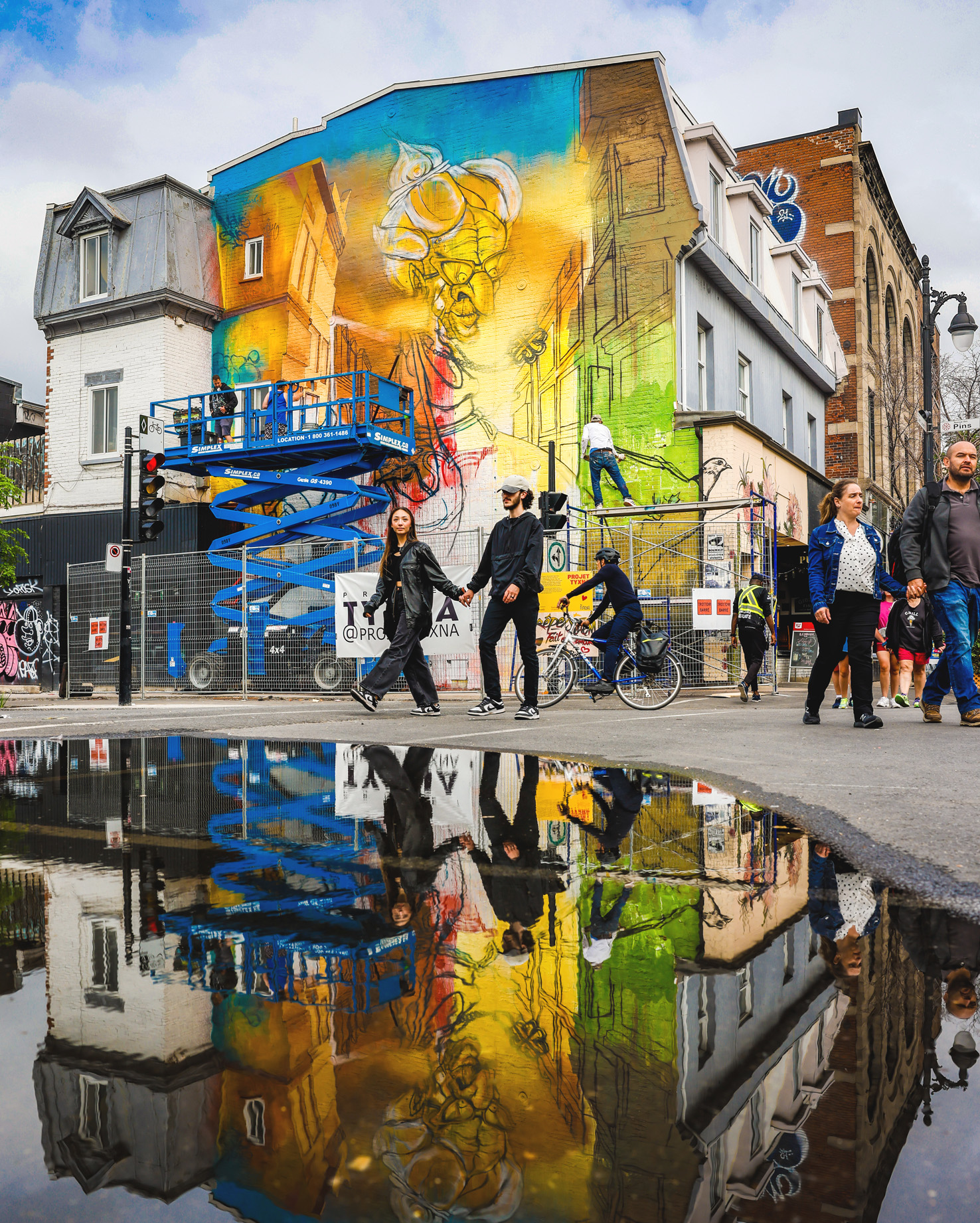 “Mémé la Main” a repris vie lors du Festival MURAL 2023 grâce à une réinterprétation signée TYXNA, qui a redonné toute sa force à cette icône emblématique du boulevard Saint-Laurent. La nouvelle murale, plus dynamique et expansive, s’intègre parfaitement à l’énergie actuelle de la Main. Sa palette riche et parfois délavée, ainsi que le processus créatif alliant spontanéité et technicité, expriment l’esprit funky et rock’n’roll de Mémé tout en préservant l’âme du quartier. Pendant dix jours, l’œuvre a cristallisé une effervescence collective, laissant une trace durable.