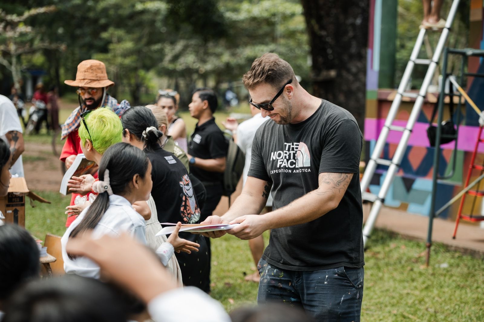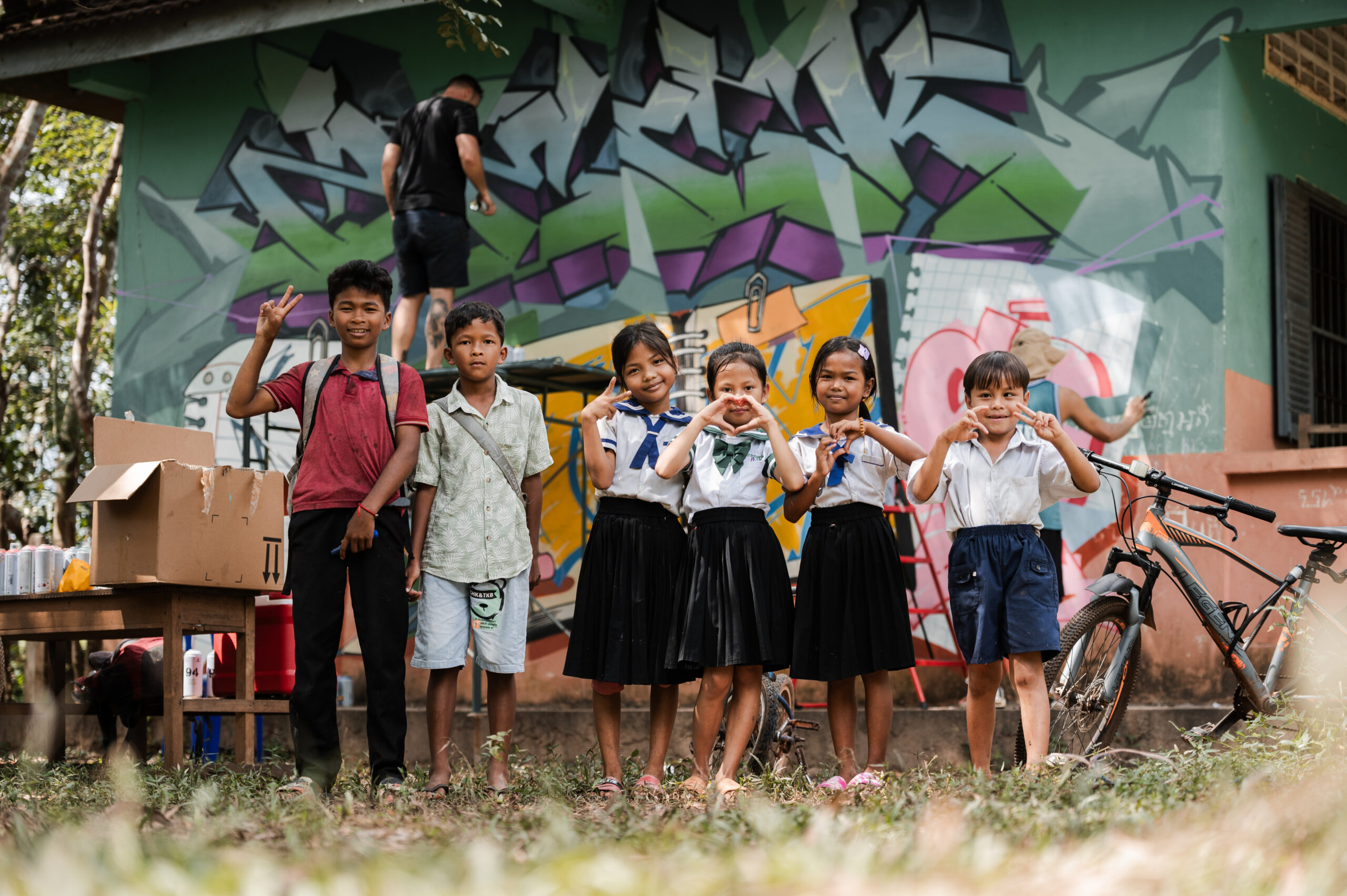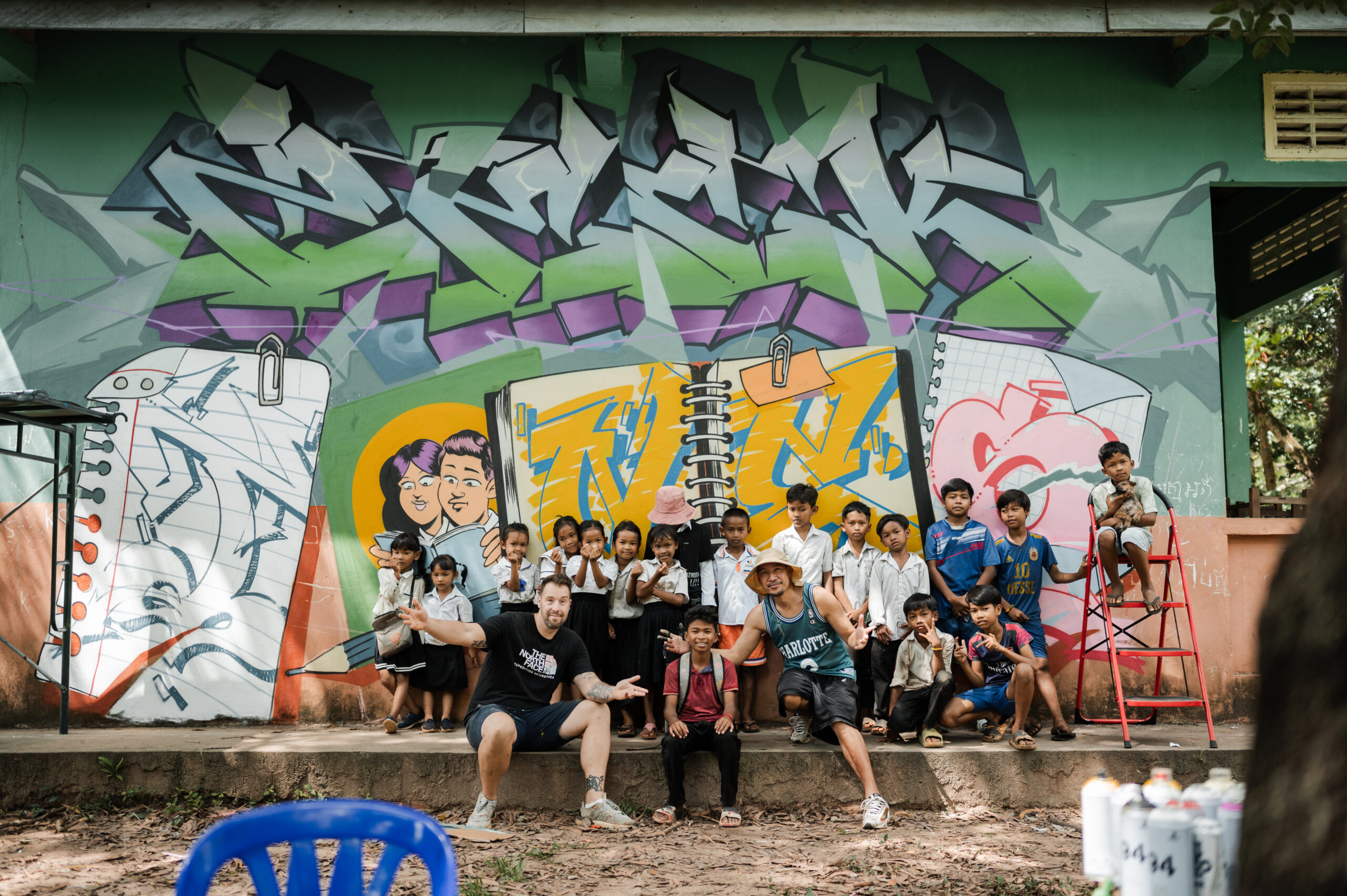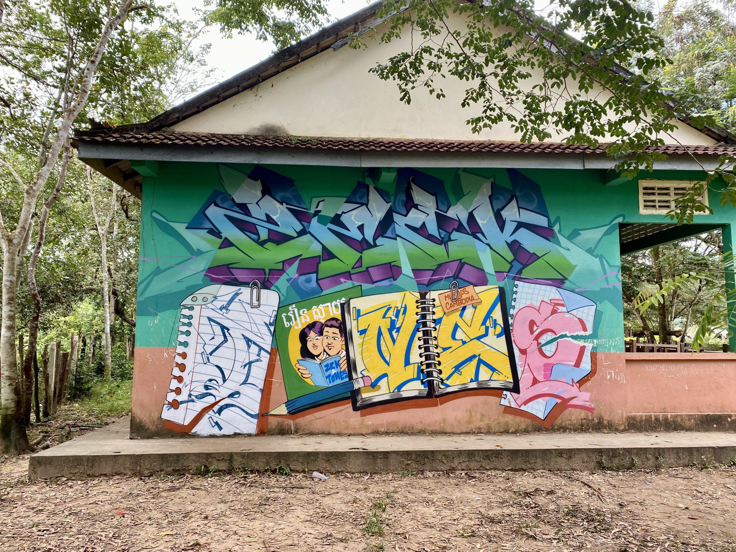 La première intervention a eu lieu dans un village reculé du Cambodge. Réalisée par les artistes Zek et Tones, cette murale a été peinte sur les murs extérieurs d’une école. Pensée comme un geste simple et direct, l’œuvre avait pour objectif d’embellir le lieu et d’apporter de la couleur et de la vie à un espace central pour la communauté locale.