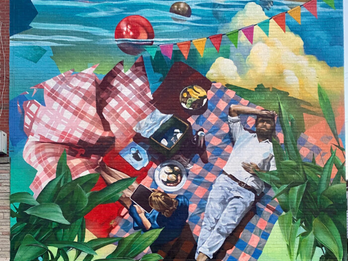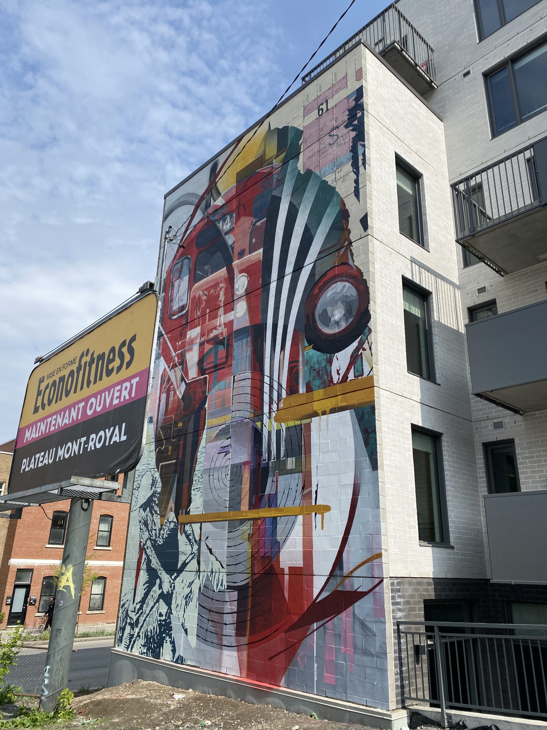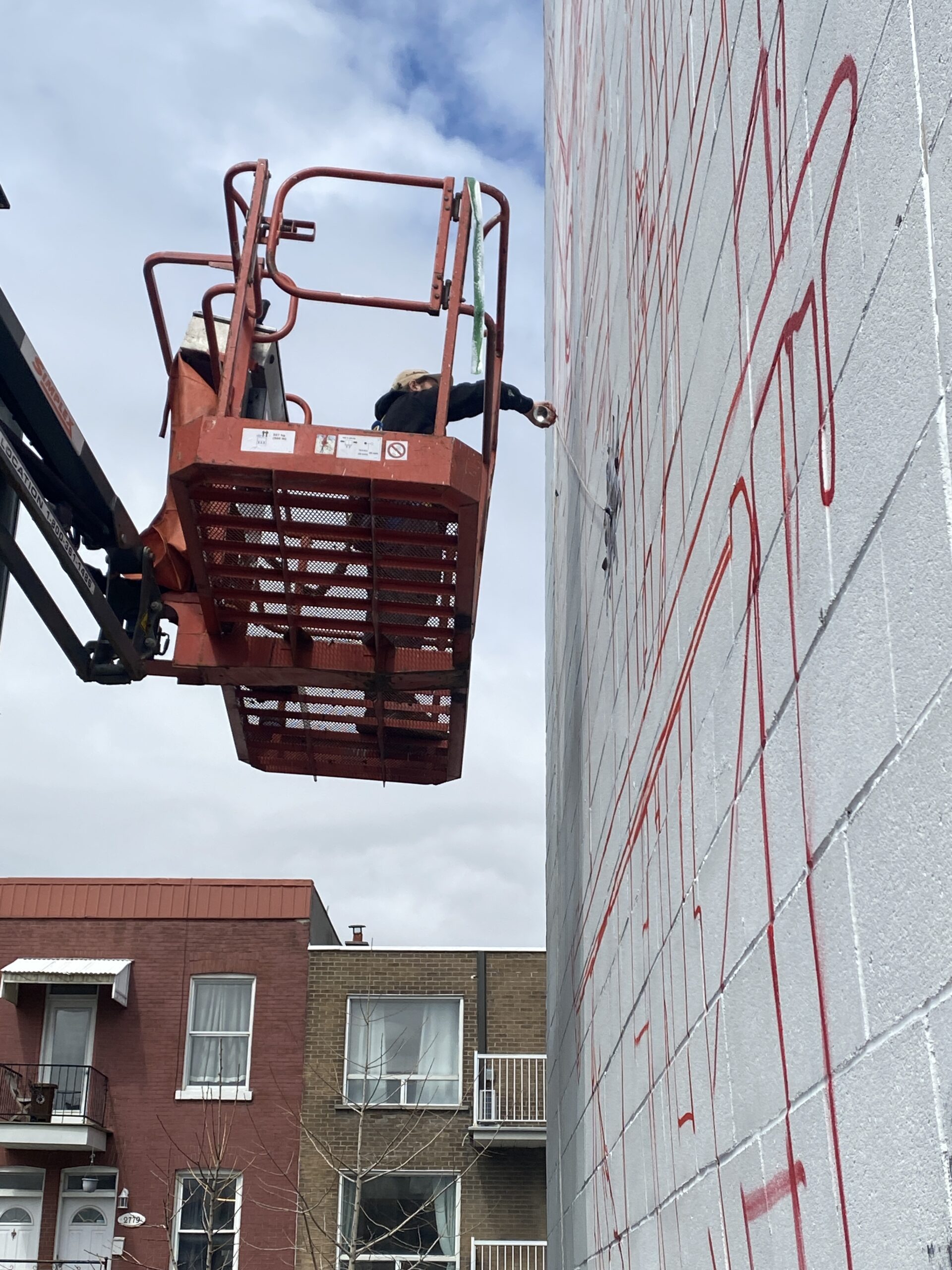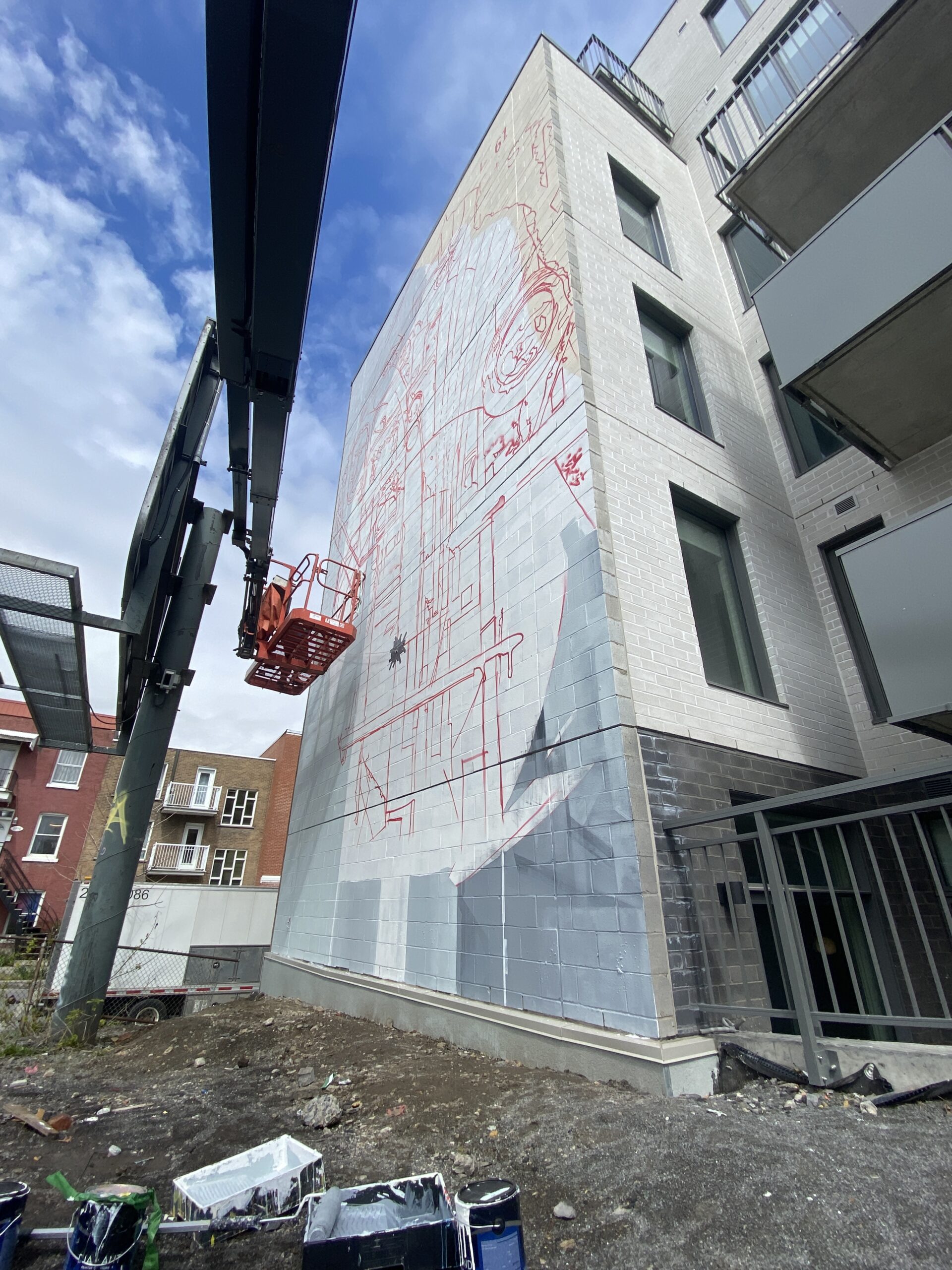Afin de permettre une appréciation complète de l’œuvre, un panneau publicitaire adjacent a également été transformé grâce à un trompe-l’œil, offrant une vue dégagée sur la murale. Visible à l’intersection des rues Ontario et Hogan, Strate s’impose aujourd’hui comme un repère artistique fort pour le quartier, autant pour les résident·es que pour les passant·es.