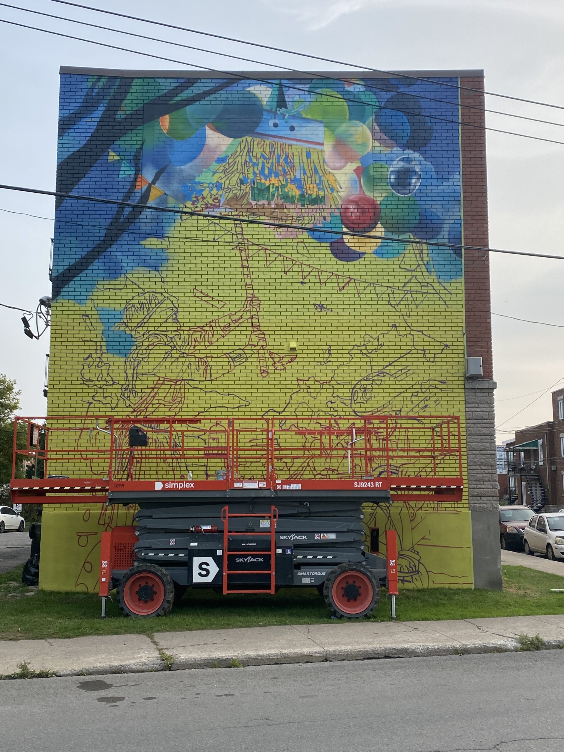 Le premier tableau propose une ambiance ludique et épanouissante, mettant en scène des enfants en pleine célébration. Le décor, inspiré du parc LaSalle, est dominé par un nuage évoquant une « barbe à papa », tandis qu’au loin apparaît, de façon anecdotique, le phare de Lachine. Cette œuvre met l’accent sur la jeunesse : une jeune fille frappe une piñata pendant qu’un garçon à vélo poursuit un pigeon. Le dynamisme des personnages, accentué par une explosion de confettis et divers accessoires récréatifs, renforce l’atmosphère festive du quartier.